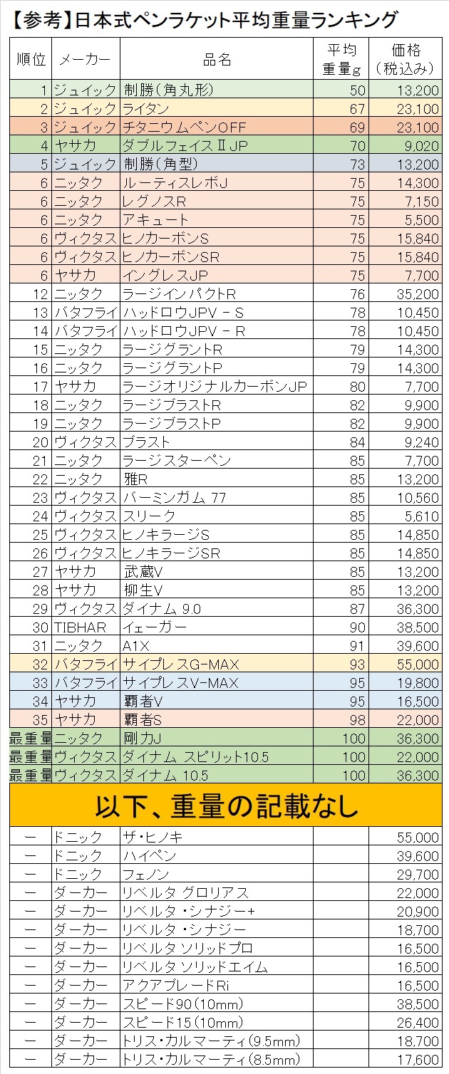 DONIC(ドニック:3種類)についても平均重量の記載がないので対象外となりました。