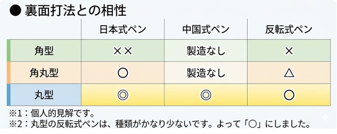また、裏面打法をやるのであれば、両ハンドの切り替えは非常に重要なので、角型はおススメしません。