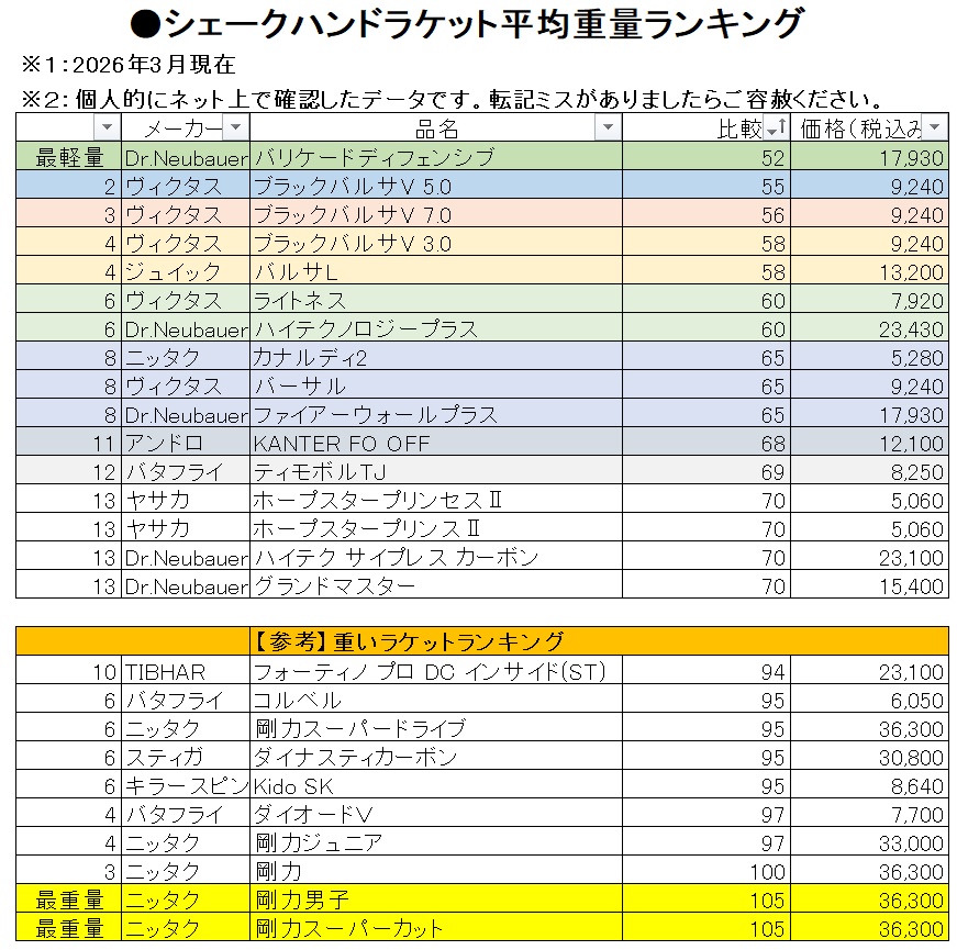 今回は、シェークハンドラケットの各メーカーのカタログ(2026年度版)表記の平均重量を比較してみましたので、興味のある方は参考までにご覧ください。